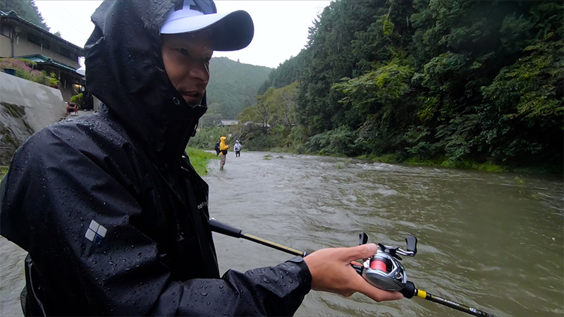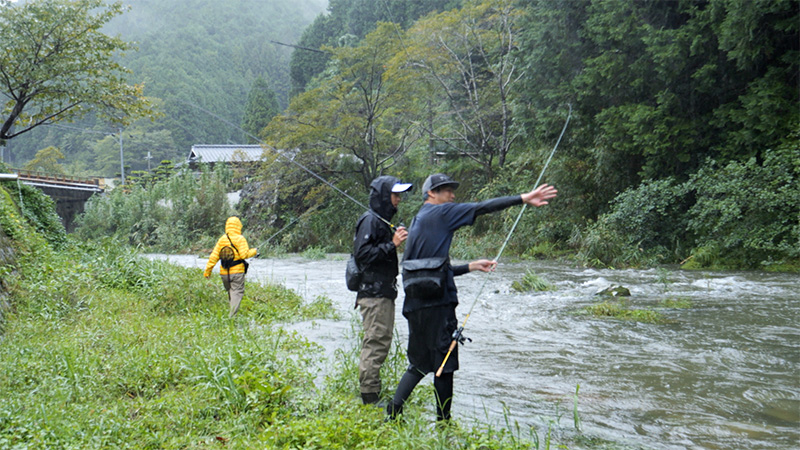 今回は、鮎を釣って、鮎尽くしのキャンプめしを作ろうと言う企画で、最近注目を集めている 鮎の新しい釣り方、「アユイング」にチャレンジした番組出演者たち。釣り好きの 番組キャンプアンバサダー 山本さんと堀西さんはもちろん、釣りガール、つぼみ大革命の恵梨華ちゃんや、キャンプめしと言えば忘れてはならない、たけだバーベキューさんをゲストに迎えてお送りします。ダイワのフィールドテスターとして、アユイングという新しい鮎釣りを提案している第一人者の木森直樹さんに釣り方を教えて頂くものの前日から降り続く雨で、厳しいコンディションでの釣りとなった和歌山県真国川での釣行はいかに…。鮎の友釣りで使う、オトリ鮎の代わりに、鮎の姿をしたルアーで釣るアユイング。縄張り意識の強い鮎の近くにルアーを泳がせて引っ掛けるそうなんですが、増水して濁った川で さすがに厳しく苦戦する出演者たち。果たして鮎を釣り上げて鮎キャンプめしを作ることが出来るのでしょうか。