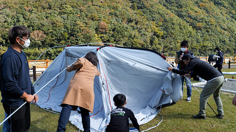 今回は、2022年12月にオープンの和歌山県日高川町 鳴滝オートキャンプ場のプレイベントとして開催された「手ぶらでキャンプ体験会」に密着。絶好のキャンプ日和となった真新しい鳴滝オートキャンプ場をに集った これからキャンプを始めてみたいという方々とともにキャンプの魅力をご紹介します。この体験会の講師を務めたのは、我らが番組キャンプアンバサダーの山本マネージャー。まずは、テント設営からスタートし、ファミリーでも十分 余裕のある2ルームテントの張り方を伝授。初めてのペグ打ちや、テントの骨組みとなるポールを扱う際のポイント・注意点を教わりながら それぞれのグループで、無事テントが張れるのか?特に寝室となるインナーテントの取り付けに苦労する参加者の皆さん。そして、アドバイスにテント間を走り回って駆け付ける講師の山本さんの姿。今回はテント設営篇をお送りします。