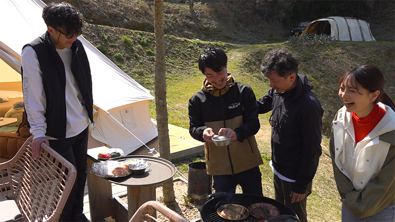 うってつけ。どこを切り取っても映える こちらでの人気アクティビティの一つが、テントサウナと露天のジャグジー風呂。サウナで整い、露天のジャグジー風呂でリラックスするレギュラー出演者のOrange山本マネージャーと堀西マネージャー、そしてゲストの「さっぴょん」こと本谷紗己さん。3人は竹林の緑と、心地良い そよ風に癒され大満足。更に「ガジュキャンプ」のもう一つの人気が、アメリカンバーベキュー。低温調理で手間と時間を惜しまずに焼き上げたフードメニューも頂く事に・・・。果たしてそのお味は??乞うご期待!!