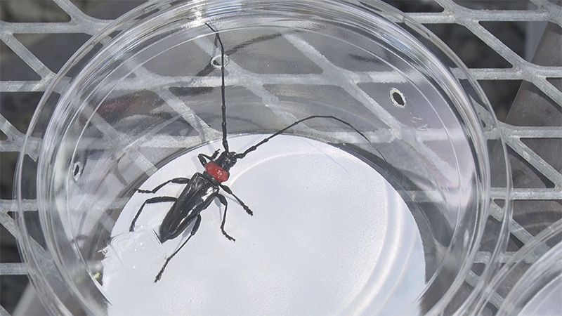 県内主力果樹のモモやスモモ、ウメを食害するクビアカツヤカミキリについて被害の実態や防除対策を紹介。