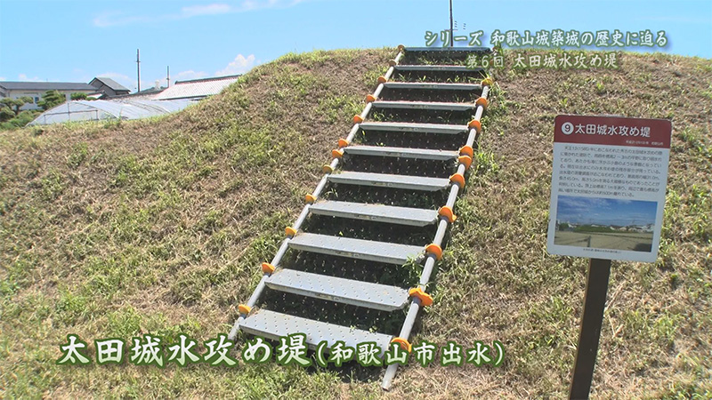 太田城水攻めの際に築かれた堤防の跡とされる「太田城水攻め提」。現在残るのは、堤防の一部のみだが、数少ない太田城に関する史跡のひとつとして県の指定文化財になっている。当時、およそ6日間で、のべ16万人もの人を動員し、和歌山駅の西側から鳴神の付近まで全長約5キロメートル、高さ13m、土台の幅が約32mと伝える巨大な堤防を築かせたと言われている。