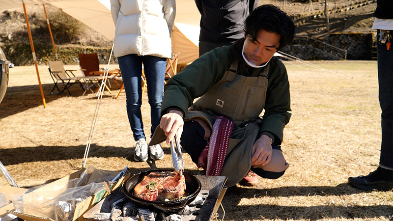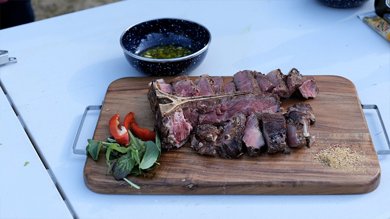 今回も人気リポーター中井裕美さんと、バーベキュー芸人として人気のたけだバーベキューさんの2人をゲストに迎えてお送りします。塊肉バーベキューシリーズの今回は炭の上に スキレットと呼ばれる 厚い鉄のフライパンを載せてT ボーンステーキの塊肉BBQの模様をお伝えします。「フィレ」と「サーロイン」の最高級部位のお肉を、1時間以上かけてじっくりと焼き上げる たけだバーベキューさん。フレンチの技法を駆使して塊肉を最高の状態に仕上げます。また、様々なハーブを使ったオリジナルソースも用意して、いざ実食!! そのお味は??また、後半は出演メンバー全員での恒例の焚き火トーク。キャンプ料理の話題など和やかな話題にほっこりする時間もお楽しみに。