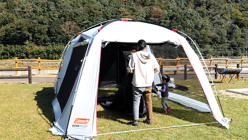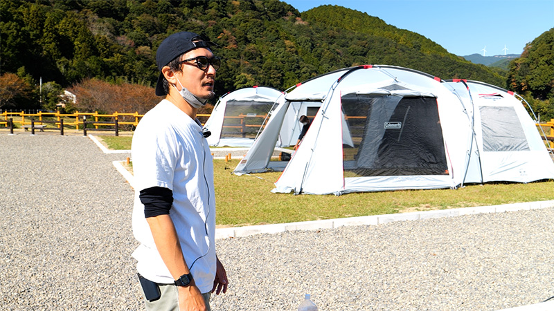 今回は、2022年12月にオープンの和歌山県日高川町 鳴滝オートキャンプ場のプレイベントとして開催された「手ぶらでキャンプ体験会」に密着。絶好のキャンプ日和となった真新しい鳴滝オートキャンプ場をに集った これからキャンプを始めてみたいという方々とともにキャンプの魅力をご紹介します。この体験会の講師を務めたのは、我らが番組キャンプアンバサダーの山本マネージャー。まずは、テント設営からスタートし、ファミリーでも十分 余裕のある2ルームテントの張り方を伝授。初めてのペグ打ちや、テントの骨組みとなるポールを扱う際のポイント・注意点を教わりながら それぞれのグループで、無事テントが張れるのか?特に寝室となるインナーテントの取り付けに苦労する参加者の皆さん。そして、アドバイスにテント間を走り回って駆け付ける講師の山本さんの姿。今回はテント設営篇をお送りします。