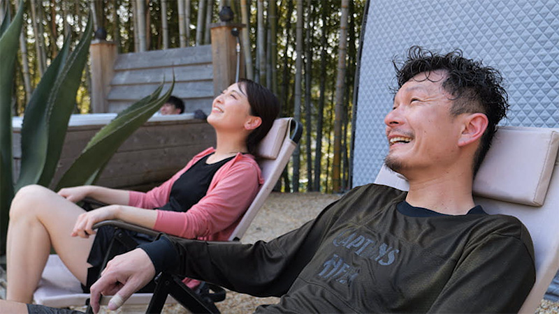 うってつけ。どこを切り取っても映える こちらでの人気アクティビティの一つが、テントサウナと露天のジャグジー風呂。サウナで整い、露天のジャグジー風呂でリラックスするレギュラー出演者のOrange山本マネージャーと堀西マネージャー、そしてゲストの「さっぴょん」こと本谷紗己さん。3人は竹林の緑と、心地良い そよ風に癒され大満足。更に「ガジュキャンプ」のもう一つの人気が、アメリカンバーベキュー。低温調理で手間と時間を惜しまずに焼き上げたフードメニューも頂く事に・・・。果たしてそのお味は??乞うご期待!!