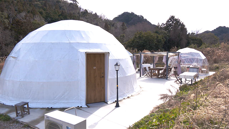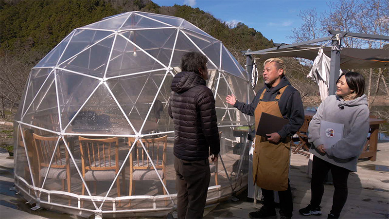 今回は大阪府南部の貝塚市へ! 二色の浜から山に向かうと、広大な敷地を持つ「かいづか いぶきヴィレッジ」が現れます。こちらはもともと農業公園ということで、コンセプトは「農業×グランピング」。グランピングエリアの総面積はなんと約5200㎡もあり、そこに大小さまざまな17棟のテントがゆったりと配置され、のどかで穏やかな時間が流れる中、素材を活かしたシェフのフレンチスタイルBBQを堪能できるんです。さらに、ジャグジー、テントサウナ、モルック、温泉も! そして、季節に応じた野菜や果物を自分で収穫して食べることもできるんです。大興奮の「やまちむ」コンビは旬の収穫体験でガチ対決! そしてキャンプ界の「○○○王」が誕生!? お楽しみに!