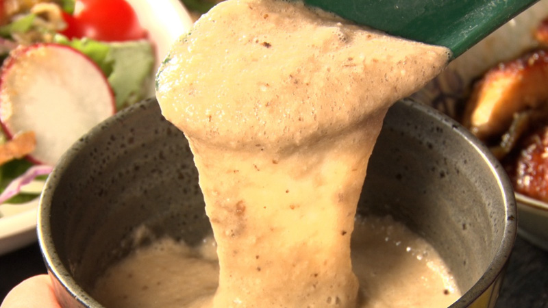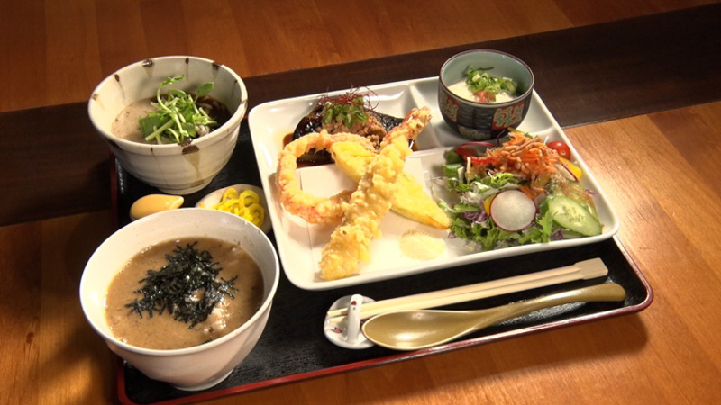明治時代に建てられた大地主の屋敷。その一角にある米蔵を改装したお店。店長の野崎俊行さんが無農薬で育てた自然薯を材料に日本そばや丼などを提供。健康志向の客が絶えない人気店。