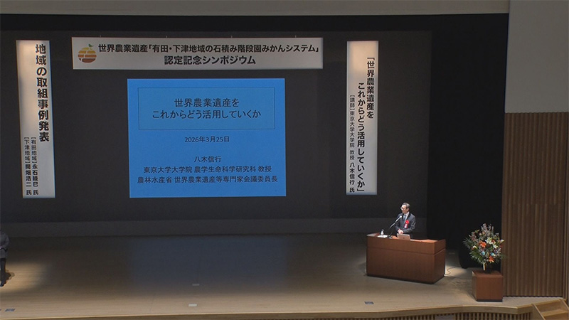 昨年8月に認定された世界農業遺産「有田・下津地域の石積み階段園みかんシステム」についての理解を深めてもらい、地域の誇りとして育むことを目的に開催される認定記念シンポジウムを紹介。