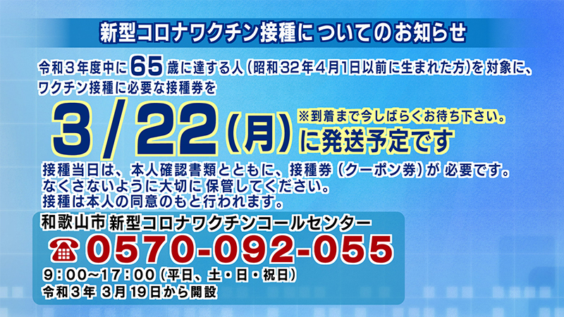 和歌山市では、令和3年度中に65歳に達する人を対象に、ワクチン接種に必要な接種券を、3月22日に発送予定です。到着まで今しばらくお待ちください。接種当日は、本人確認書類とともに、接種券が必要です。接種当日まで、接種券はなくさないように)大切に保管してください。新型コロナワクチン接種についてのご相談は、ご覧の番号までお願いします。