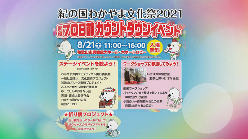 紀の国わかやま文化祭2021の開催に向け、市民の皆様に文化・芸術に親しむ機会を作り、文化祭に対する興味や関心を深めていただくため、8月21日(土)午前11時から和歌山市民会館大ホールにて開催する「70日前カウントダウンイベント」についても紹介します。