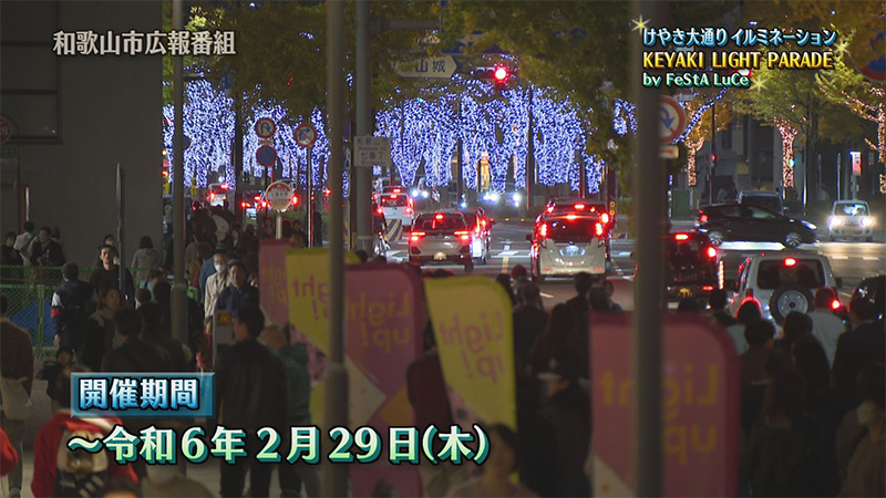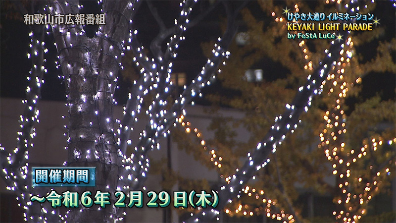 和歌山市の玄関口JR和歌山駅前から、和歌山城前までのけやき大通りおよそ2キロの区間が光輝くイルミネーションの並木道に変身。